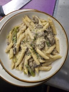 28tender steak tips simmered in a white truffle cream sauce with fresh made al dente fettuccine, asparagus, and mushrooms finished with a sprinkle of parmesan